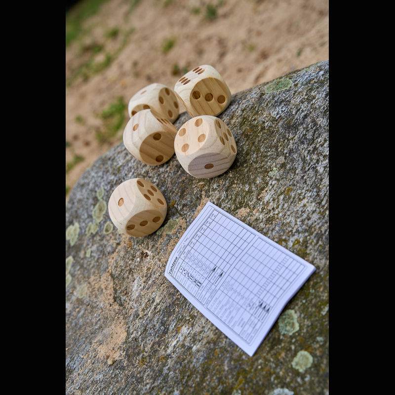 XXL kockapóker készlet, 5 fa dobókockából és egy praktikus vászonzsákból áll. Strapabíró és könnyen szállítható az órákig tartó játékélményhez.