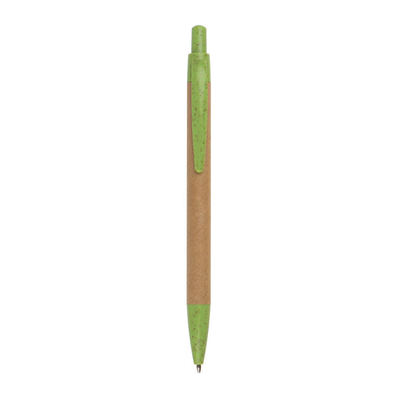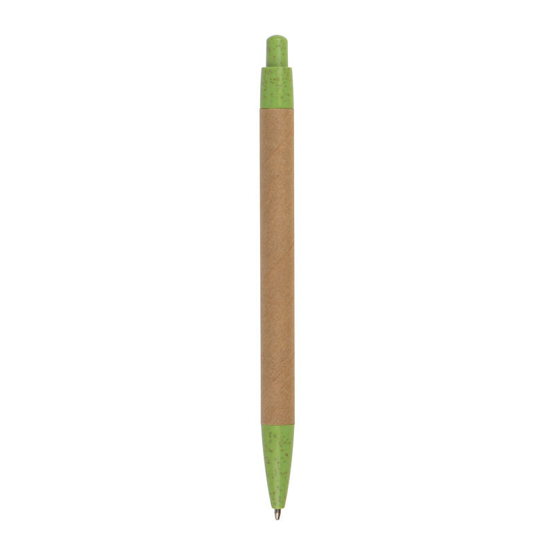 Nyomógombos golyóstoll újrahasznosított kartonból, amelynek minden alkatrésze búzaszalma felhasználásával készült, kék tintapatronnal.