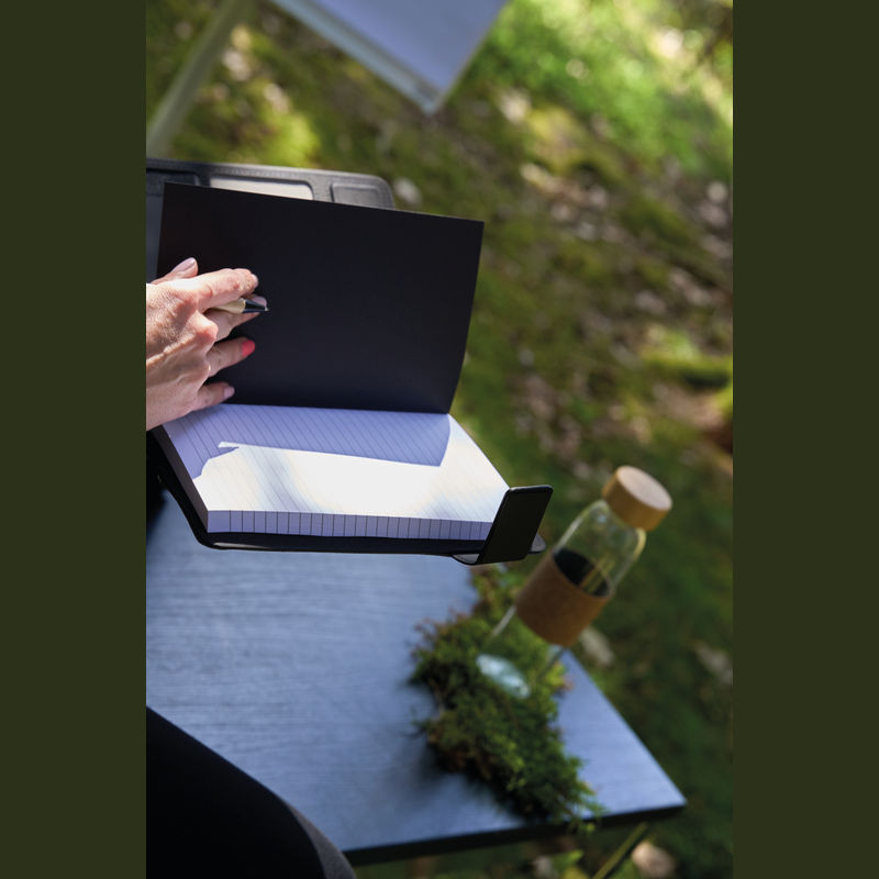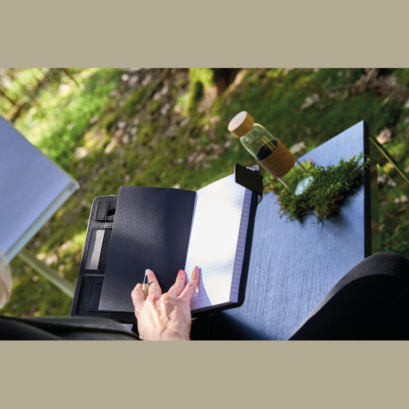 A5 formátumú mappa beépített 4000 mAh kapacitású külső akkumulátorral, 128 oldalas jegyzetfüzettel, és külső rekesszel.