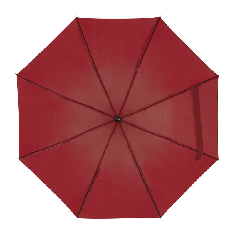 Összecsukható, teleszkópos fém esernyő, nylon tokkal, fekete műanyag markolattal és csuklópánttal.