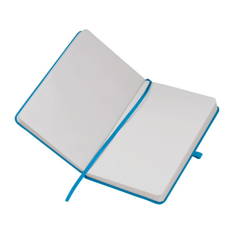 A6 méretű jegyzettömb PU borítással, 190 sima fehér oldallal. Színes gumis pánttal, könyvjelző szalaggal és praktikus tolltartó hurokkal ellátva.
