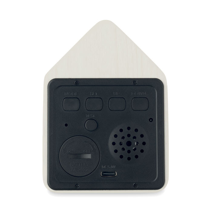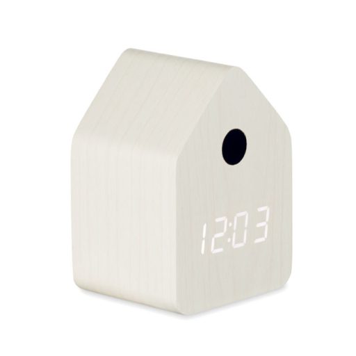 Kis MDF asztali óra beépített ébresztővel, kakukk hanggal és hőmérséklet-kijelzéssel. A madár minden egész órában, illetve ébresztéskor kakukk hangot ad ki. Fehér LED kijelző. A hang automatikusan elnémul 22:00 és 06:00 óra között. Szundi funkció 5 perces időközökkel.