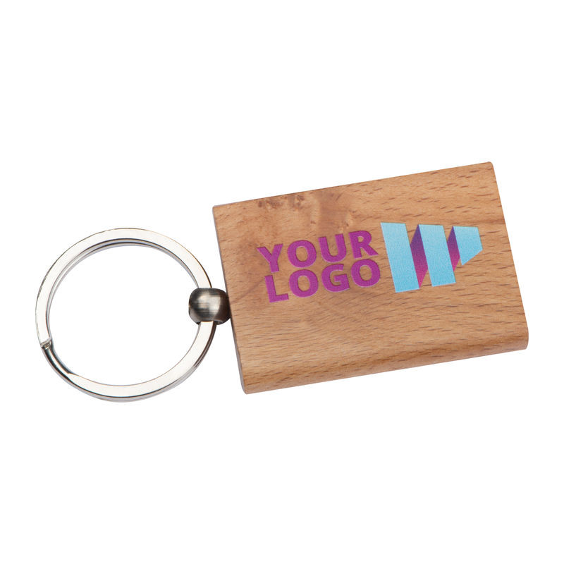 Téglalap alakú bükkfa kulcstartó, fém kulcskarikával felszerelve.