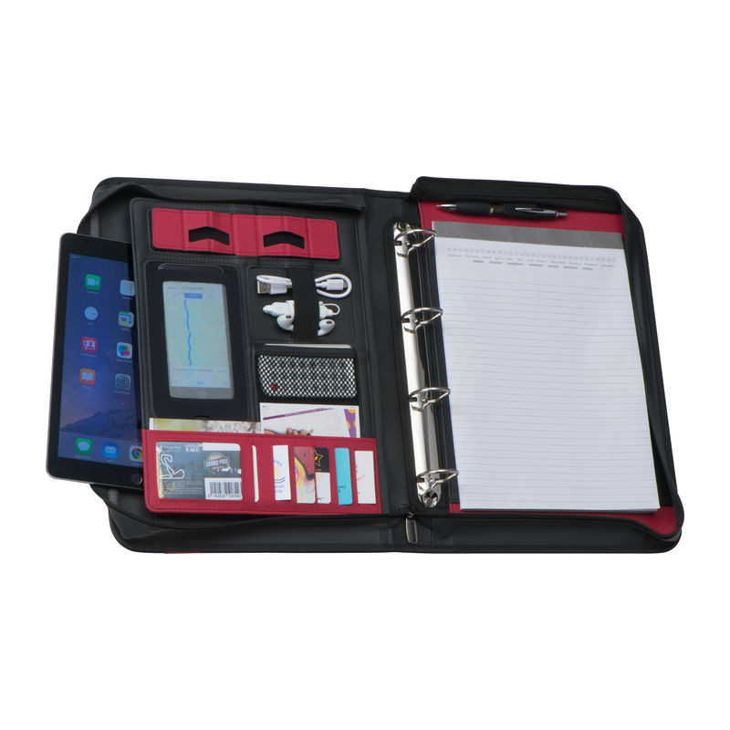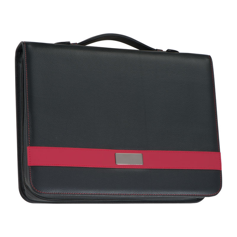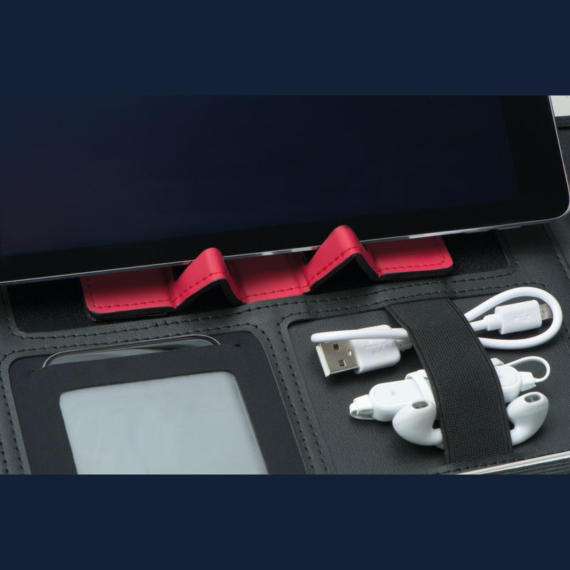 A4- es konferencia mappa tolltartóval, 4D-s gyűrűszerkezettel, 60 oldalas vonalas jegyzettömbbel, tablettartóval, mobiltartóval, elasztikus pánttal, 8 különálló rekesszel, egy nagy rekesszel, cipzárral és hordozó füllel ellátva.