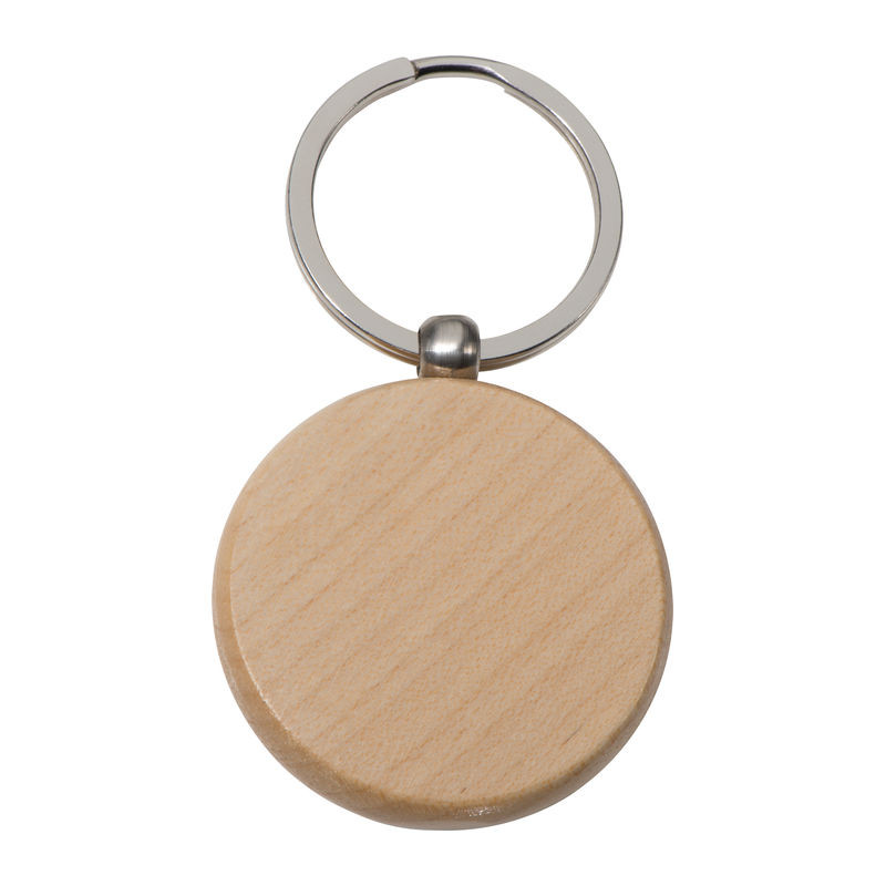 Kerek bükkfa kulcstartó, fém kulcskarikával felszerelve.