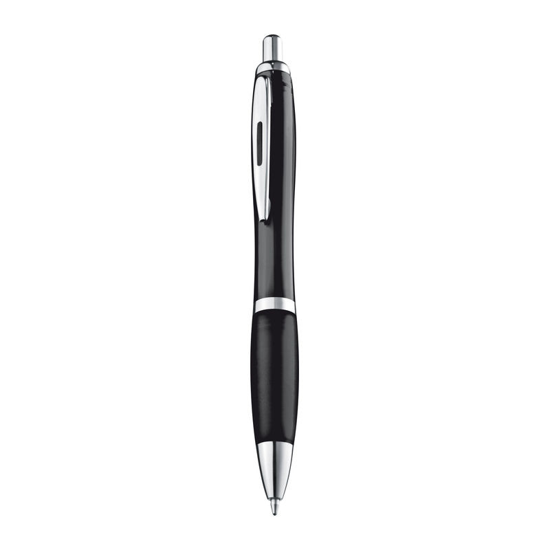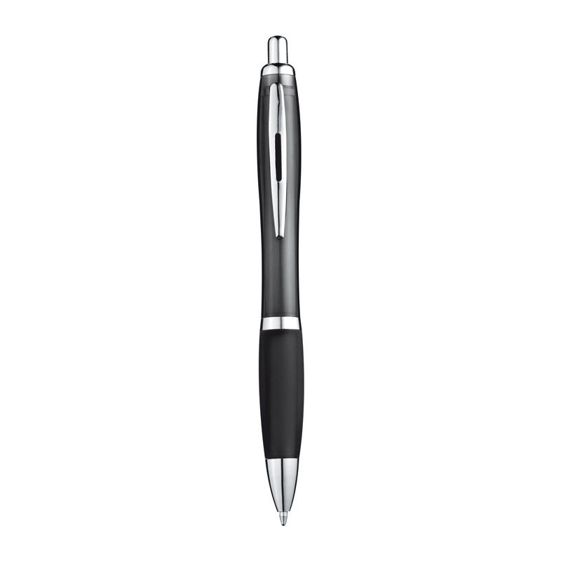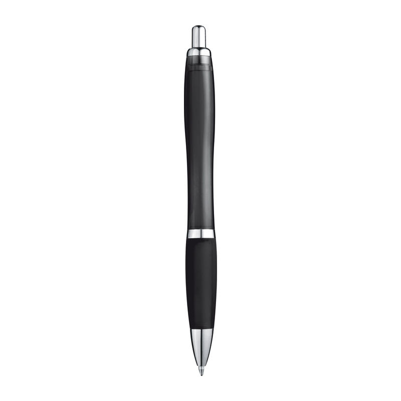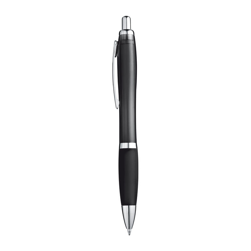 Műanyag golyóstoll, színes tolltesttel és króm kiegészítőkkel. A toll nyomógombos szerkezettel, színes csúszásgátló fogórésszel és nagyméretű kék tollbetéttel van ellátva.