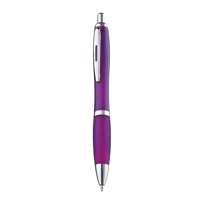 Műanyag golyóstoll, színes tolltesttel és króm kiegészítőkkel. A toll nyomógombos szerkezettel, színes csúszásgátló fogórésszel és nagyméretű kék tollbetéttel van ellátva.