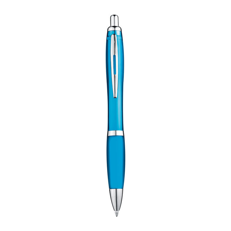 Műanyag golyóstoll, színes tolltesttel és króm kiegészítőkkel. A toll nyomógombos szerkezettel, színes csúszásgátló fogórésszel és nagyméretű kék tollbetéttel van ellátva.