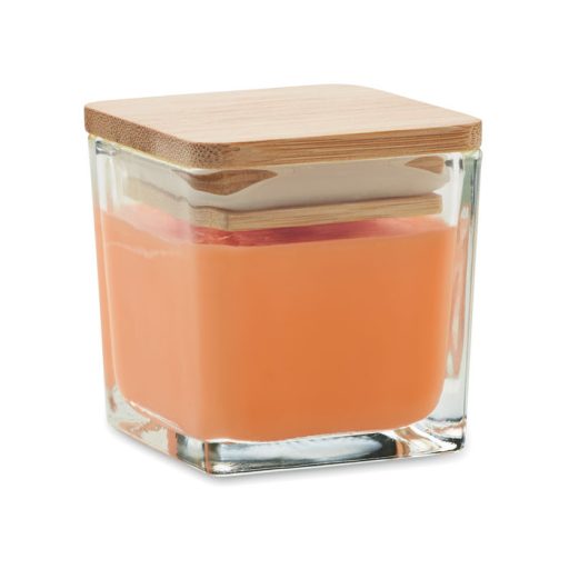 Illatosított növényi alapú viaszgyertya szögletes üvegtartóban, bambuszfedéllel. 50 g. Égési idő: 8 óra. Aroma: fehér (06) vanília, sárga (08) citrom, narancs (10) narancs, zöld (48) alma.