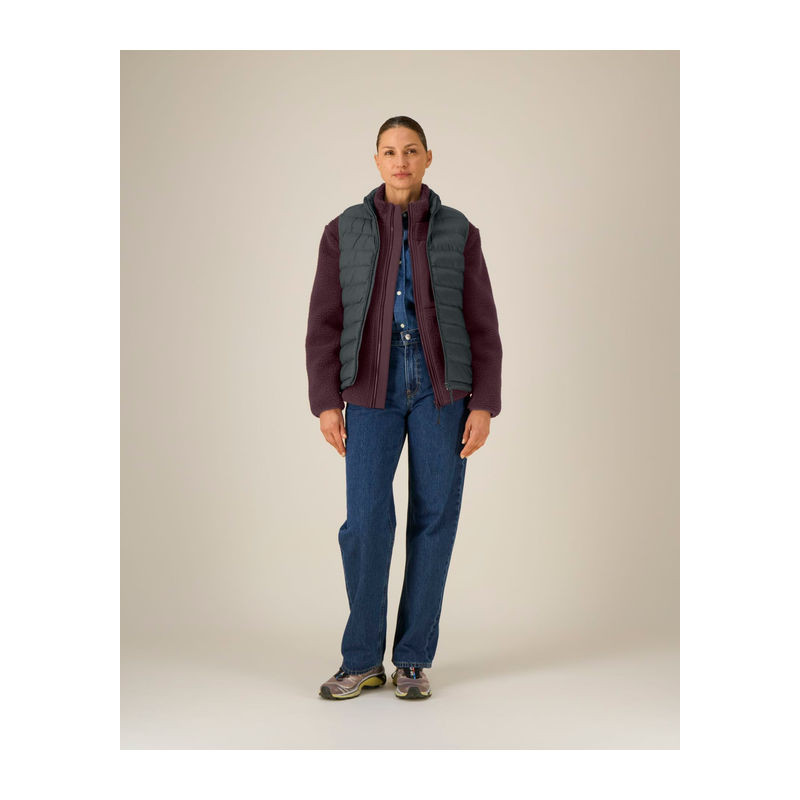 Ujjatlan kialakítás. Magas gallér. Fordított nejlon cipzár elöl, középen. Cipzáras zsebek díszszalaggal ellátott húzóval. Rugalmas szegőszalag a karkivágásnál. Teljesen steppelt kivitel. Oldalpanelek a jobb illeszkedésért. A belső varratok szegéllyel eldolgozva. Az alsó szegély állítható műanyag záróval és rugalmas zsinórral.