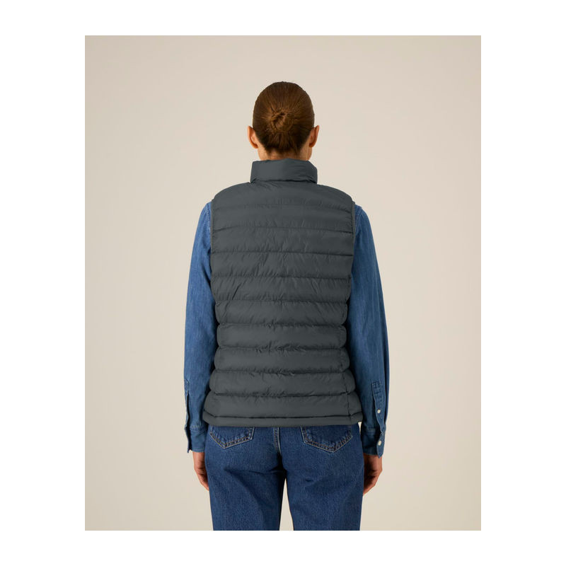 Ujjatlan kialakítás. Magas gallér. Fordított nejlon cipzár elöl, középen. Cipzáras zsebek díszszalaggal ellátott húzóval. Rugalmas szegőszalag a karkivágásnál. Teljesen steppelt kivitel. Oldalpanelek a jobb illeszkedésért. A belső varratok szegéllyel eldolgozva. Az alsó szegély állítható műanyag záróval és rugalmas zsinórral.