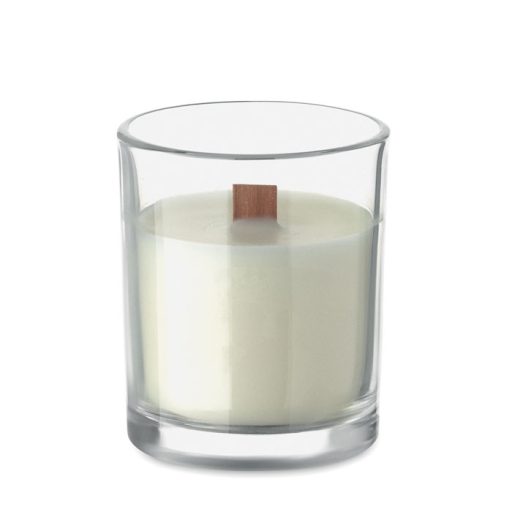 Vanília illatú, növényi alapú viaszgyertya üveg tartóban, fa kanóccal. 80 g. Égési idő 14 óra.