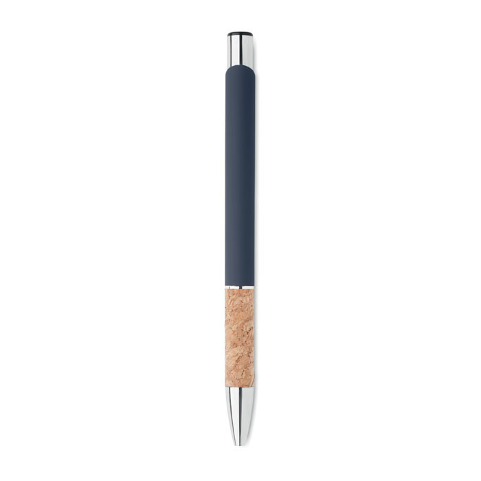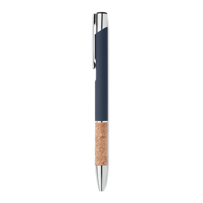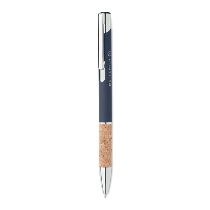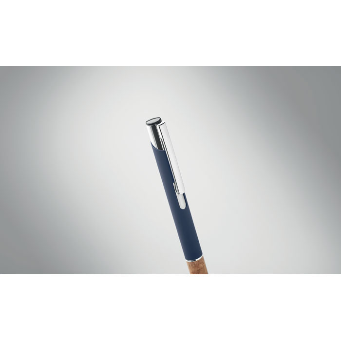 Nyomógombos toll alumíniumból, parafa markolattal. Kéken író betéttel.