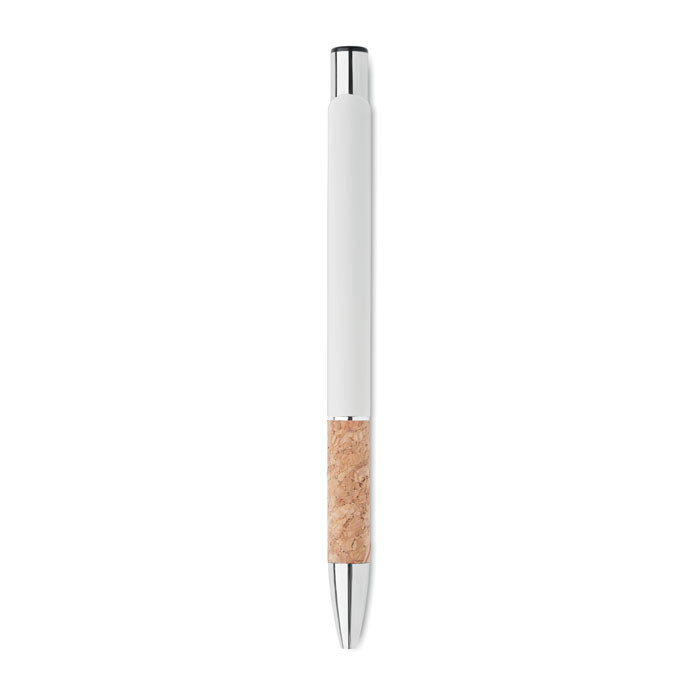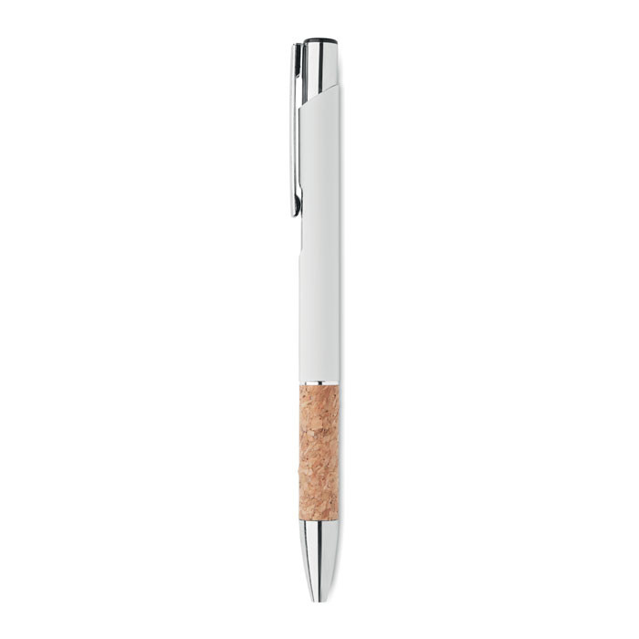 Nyomógombos toll alumíniumból, parafa markolattal. Kéken író betéttel.
