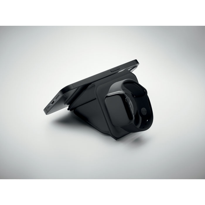 3 az 1-ben összecsukható töltőállomás ABS-ből. 3 vezeték nélküli töltési ponttal rendelkezik. Bemenet: 2 az 1-ben C-típusú és USB-A. Összteljesítmény: 15W.