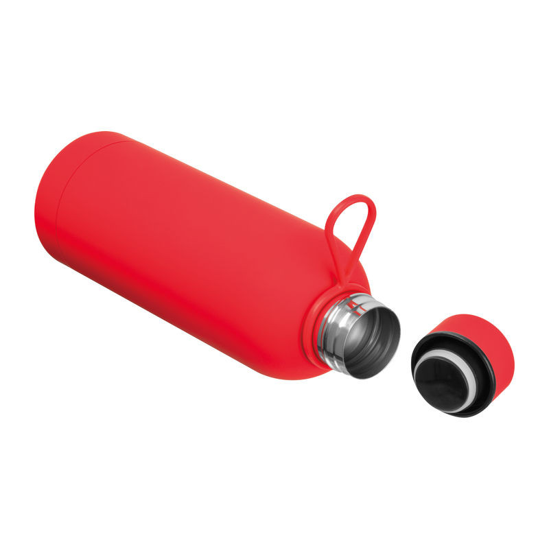 Tartós, praktikus kialakítású rozsdamentesacél kulacs. A csúszásmentes, gumírozott felület biztos fogást garantál, a hordozófül pedig kényelmes megoldást kínál a mindennapi használathoz.