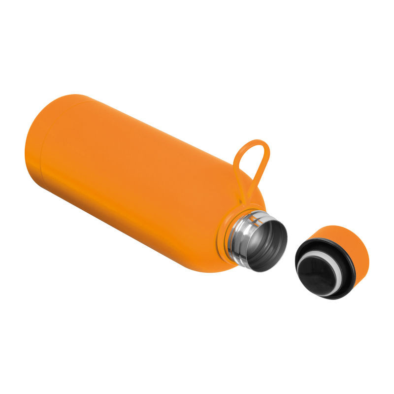 Tartós, praktikus kialakítású rozsdamentesacél kulacs. A csúszásmentes, gumírozott felület biztos fogást garantál, a hordozófül pedig kényelmes megoldást kínál a mindennapi használathoz.