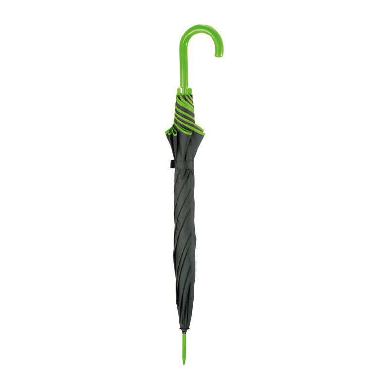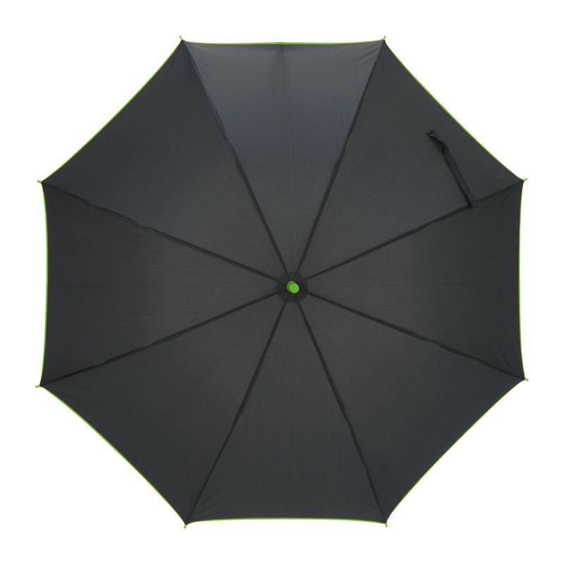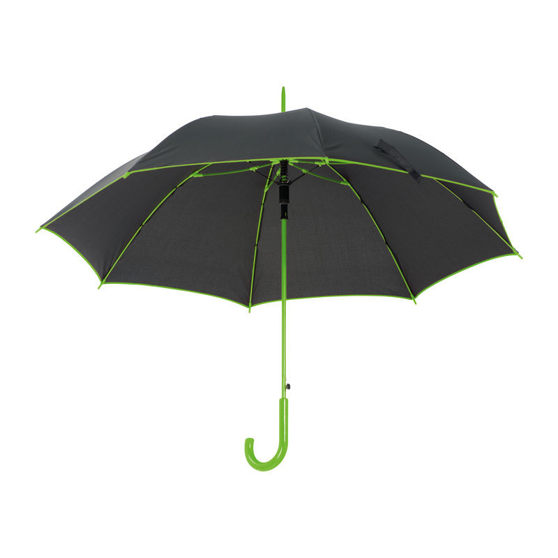 190T poliészterből készült esernyő, színes szegéllyel. Színezett műanyag markolattal, illetve azonos színű lakkozott nyéllel.