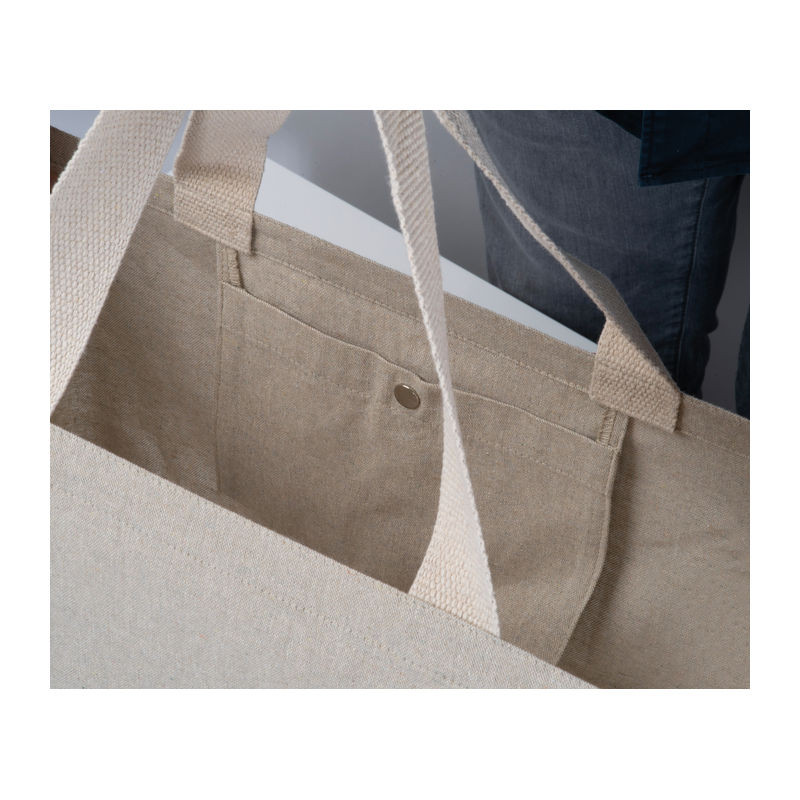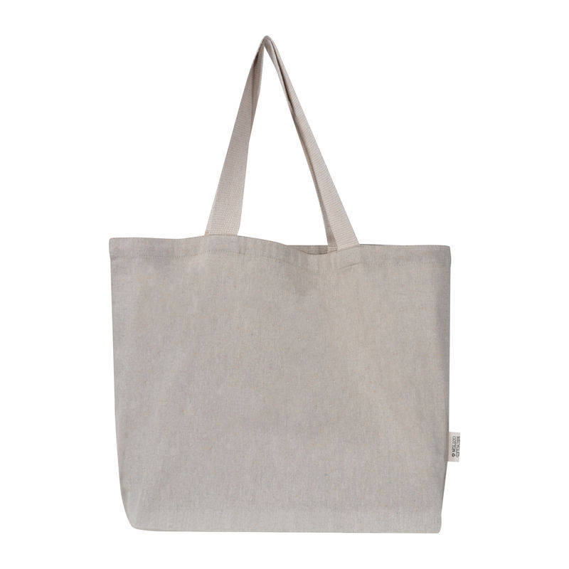 A 200 g/m² anyagsúlyú bevásárlótáska tartósságot és strapabírást biztosít a mindennapi használathoz. Ideális vásárláshoz, szabadidős tevékenységekhez vagy rendezvényekhez. A tágas méret bőséges tárolóhelyet kínál, míg a hulladékból újrahasznosított pamut anyag fenntartható megjelenést kölcsönöz, kiváló választás egyedi márkajelzéshez.