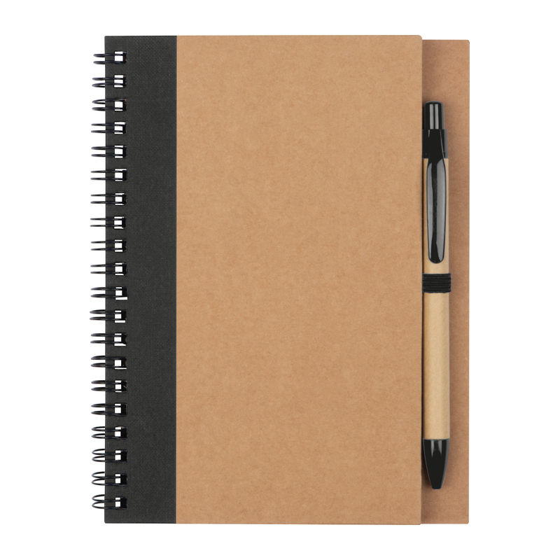 120 oldalas spirálfüzet, sima fehér lapokkal, újrahasznosított papírból. Továbbá a szett rész egy kéken író golyóstoll, mely ABS és papír felhasználásával készült.