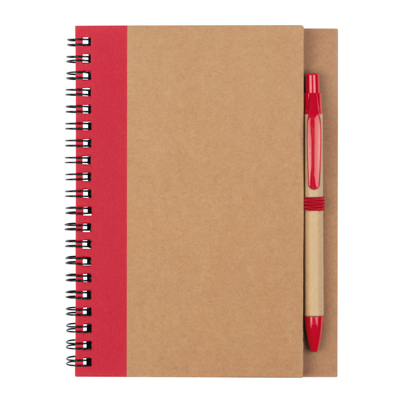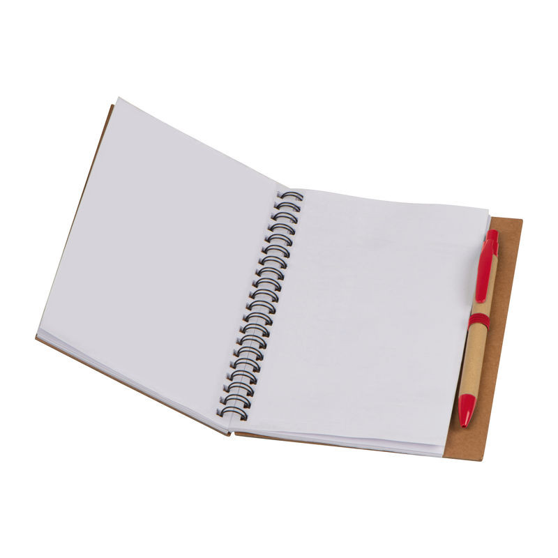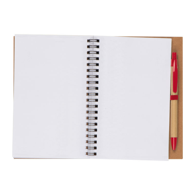 120 oldalas spirálfüzet, sima fehér lapokkal, újrahasznosított papírból. Továbbá a szett rész egy kéken író golyóstoll, mely ABS és papír felhasználásával készült.