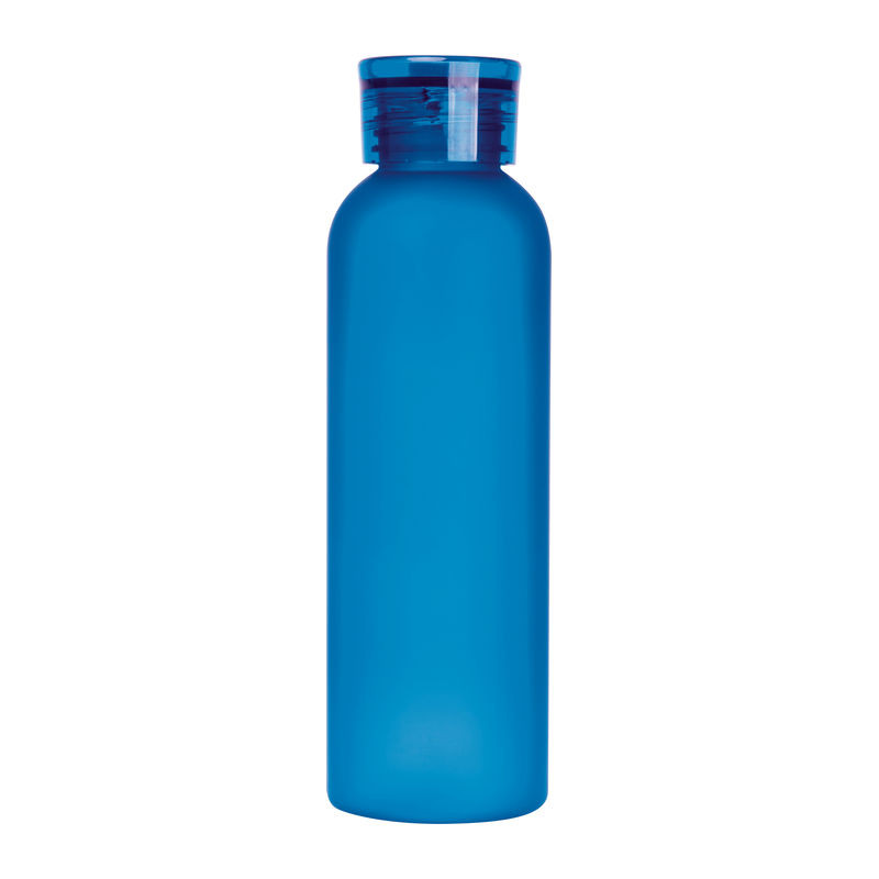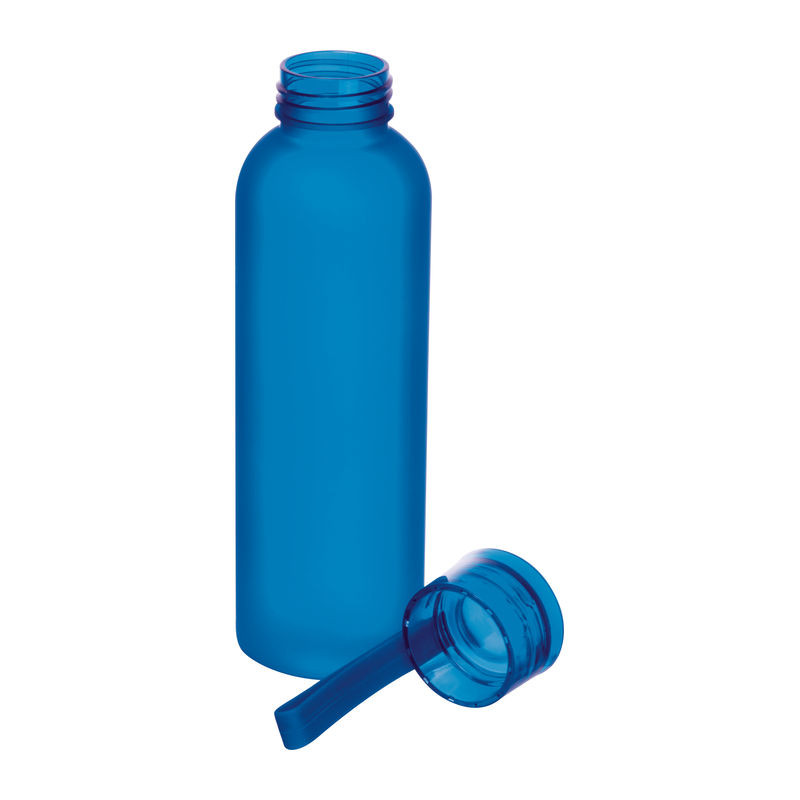 PET anyagú kulacs, amely gumírozott hordozószíjjal rendelkezik a kupakon, és 600 ml űrtartalmú. A palack matt felülete különösen kellemes tapintású.