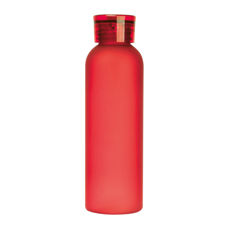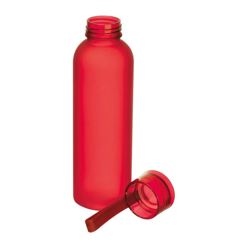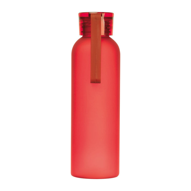 PET anyagú kulacs, amely gumírozott hordozószíjjal rendelkezik a kupakon, és 600 ml űrtartalmú. A palack matt felülete különösen kellemes tapintású.
