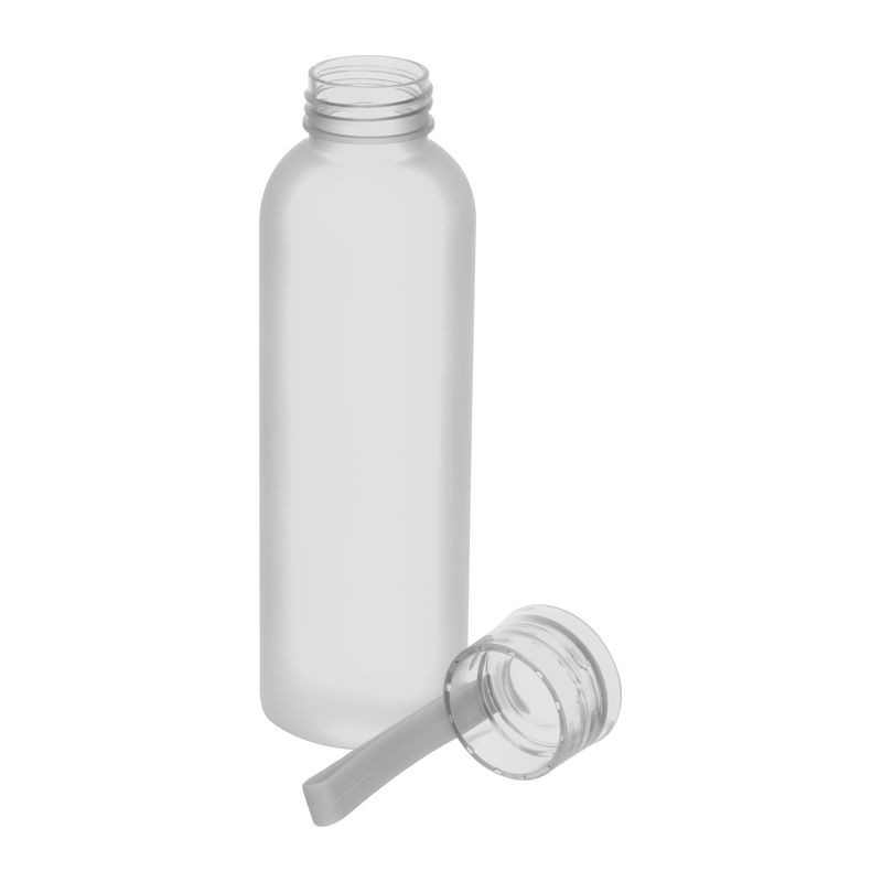 PET anyagú kulacs, amely gumírozott hordozószíjjal rendelkezik a kupakon, és 600 ml űrtartalmú. A palack matt felülete különösen kellemes tapintású.