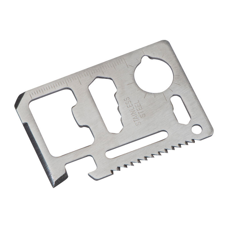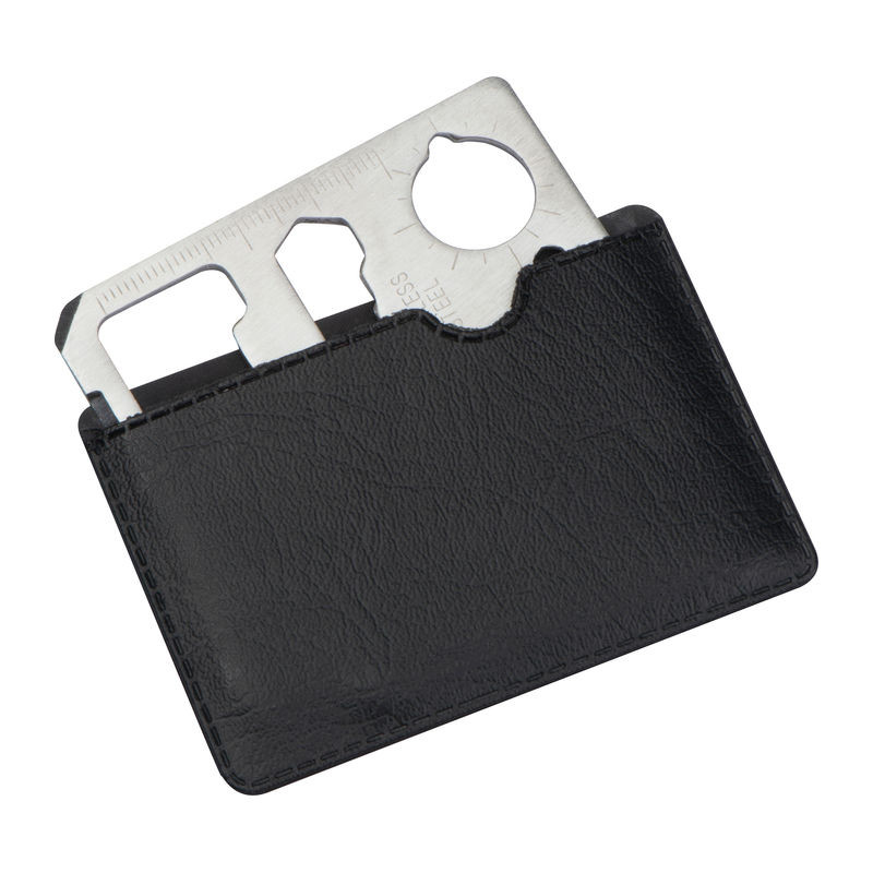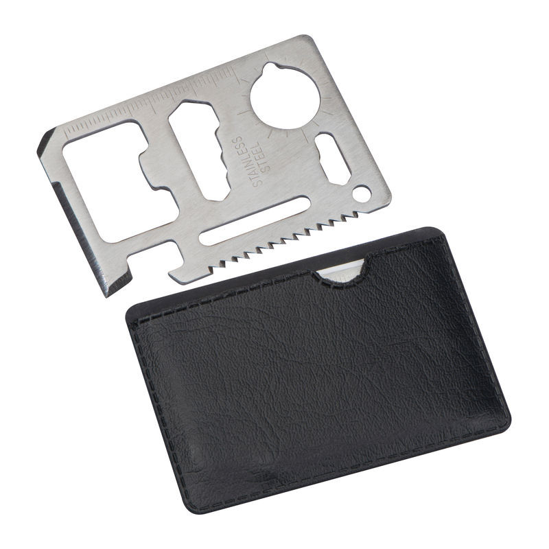 16 funkciós rozdamentes acélből készült zseb szerszám. Funkciói: PU tok, konzervnyitó, kés, csavarhúzó, sörnyitó, vonalzó, 4 imbuszkulcs (6/7/8/10mm), szögmérő, 2 imbuszkulcs (4/5mm), függesztőszem, fűrész, pillangókulcs.