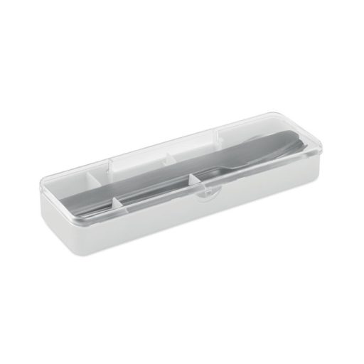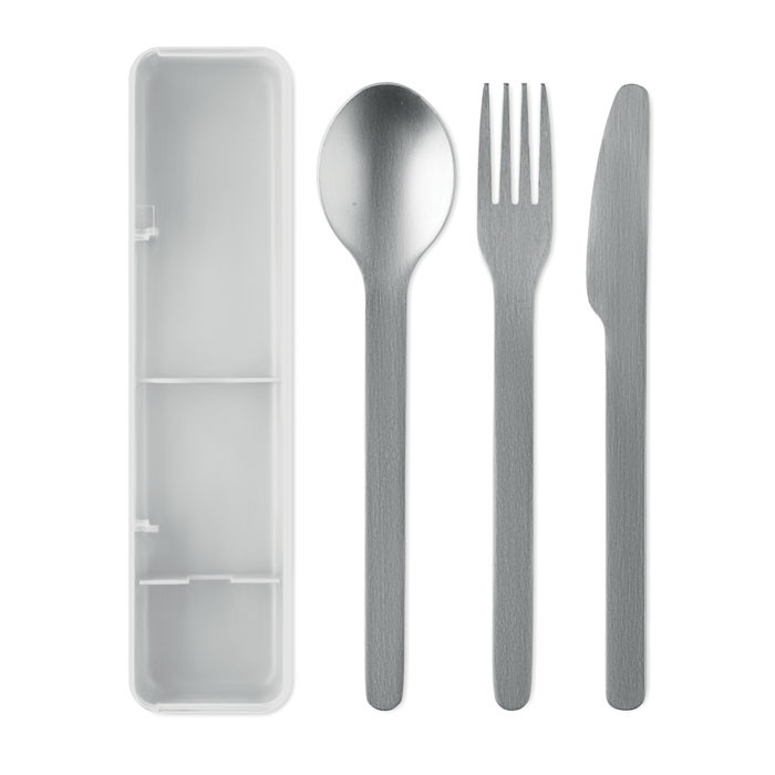 Rozsdamentes acél evőeszközkészlet PP tokban. A készlet villát, kést és kanalat tartalmaz.