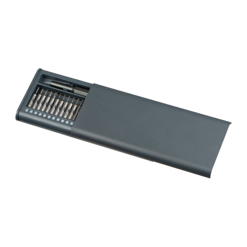Szerszámkészlet 25 precíziós lapos, kereszt és Torx bitfejjel rozsdamentes acélból és mágneses tartóval. Kényelmesen nyitható csúsztatható műanyag dobozba csomagolva. A szettben helyet kapott egy magnetizáló és egy demagnetizáló mélyedés is.