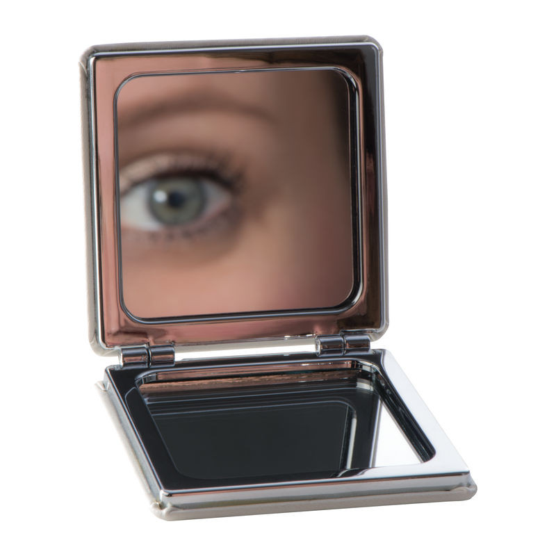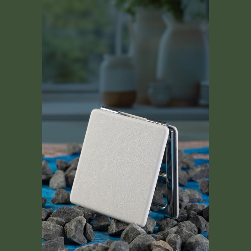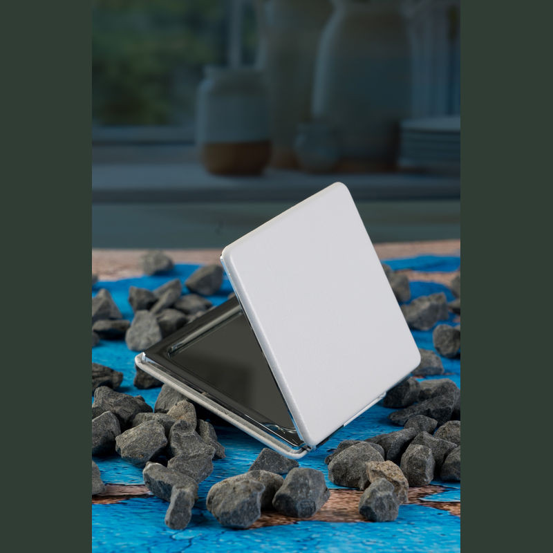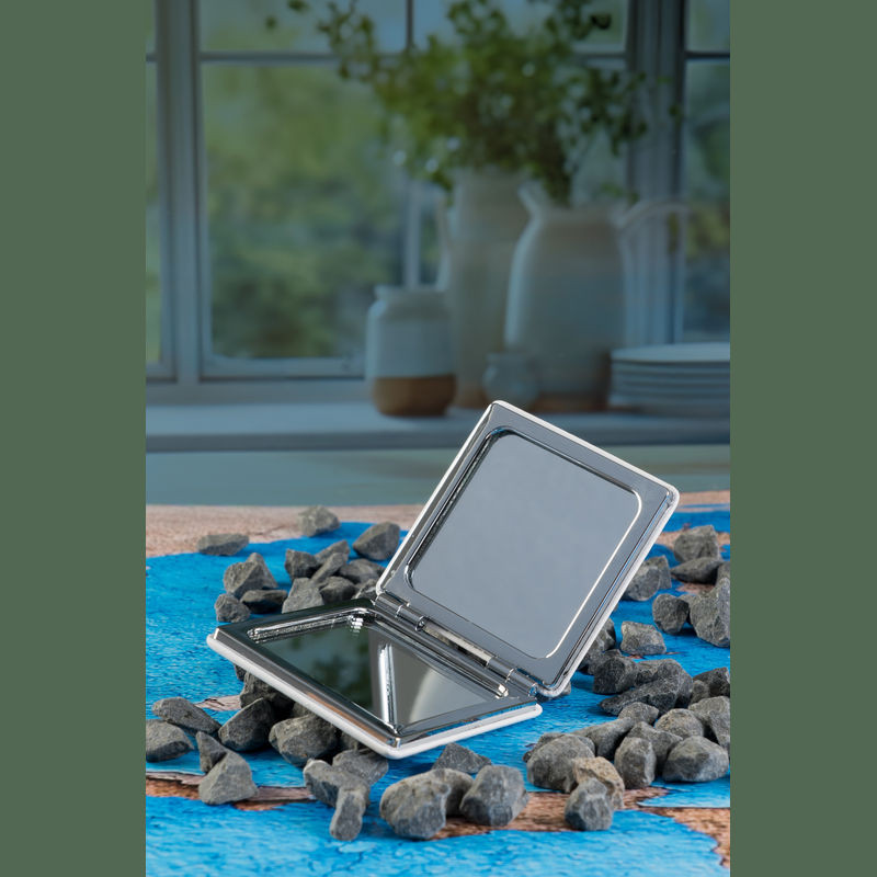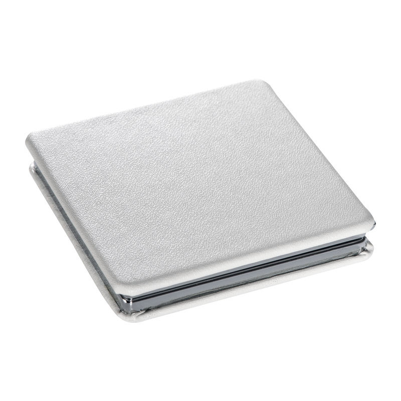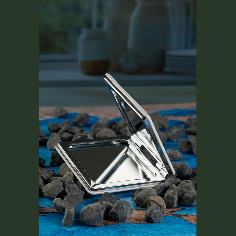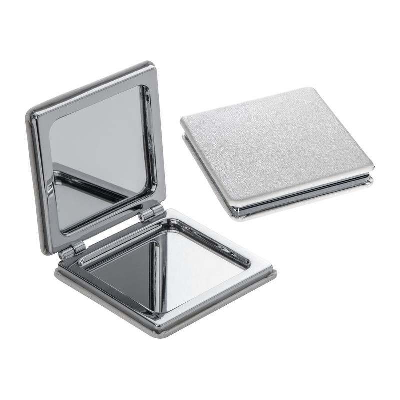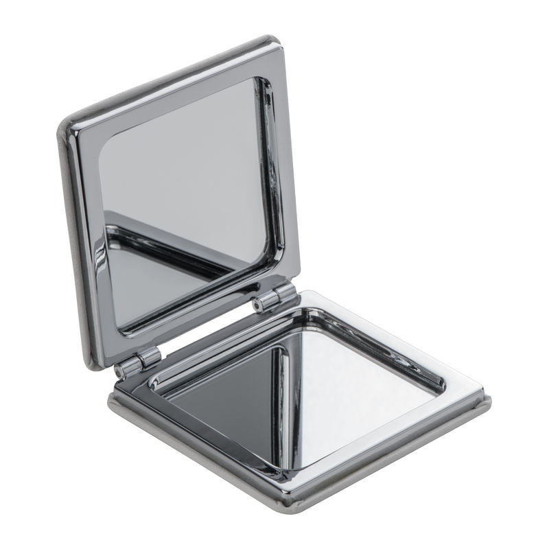 Törésbiztos dupla tükör polírozott fémből. Egyik oldalán átlagos tükörrel, másikon nagyító tükörrel, elegáns borítással.