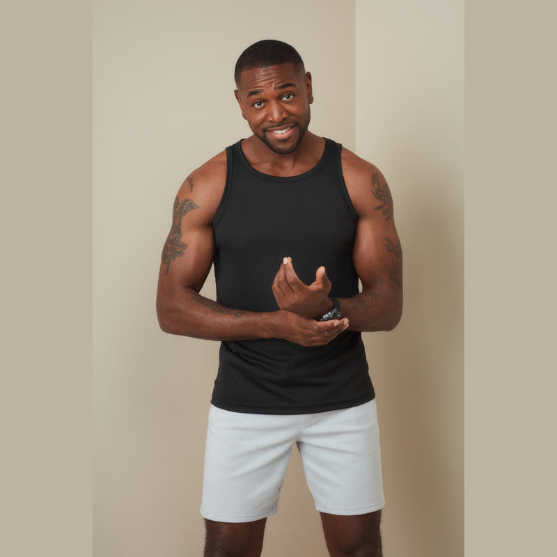Testhez simuló, rendkívül rugalmas férfi sportfelső, amely gyorsan száradó, légáteresztő interlock anyagból készült, kiváló nedvességszabályozó tulajdonságokkal. 100% АCTIVE-DRY° poliészter