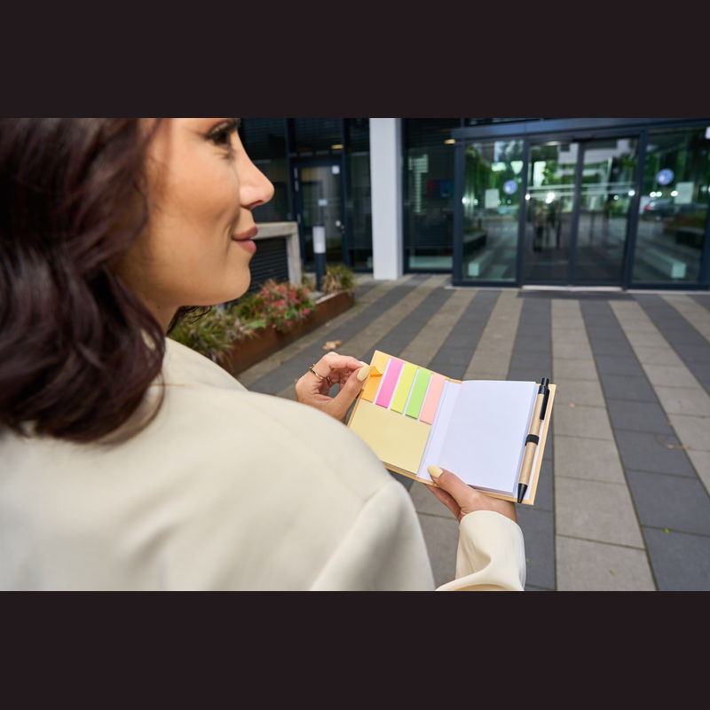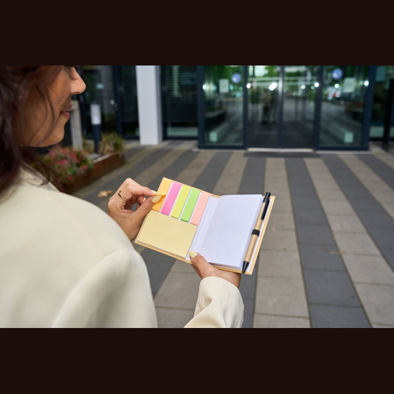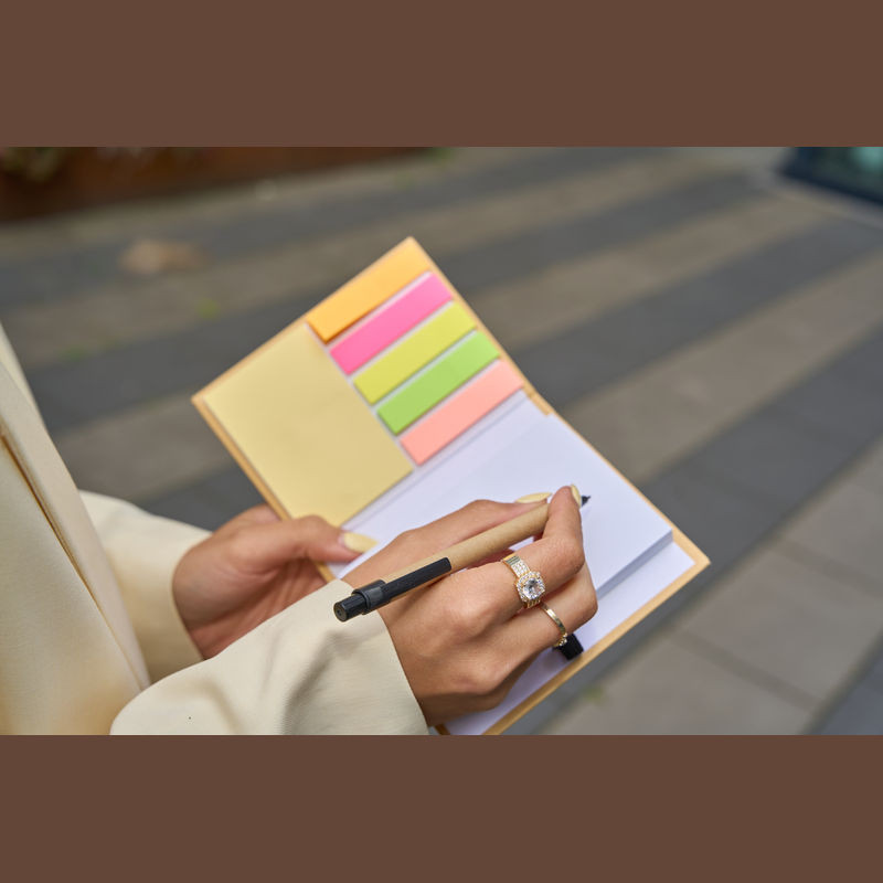 Egy praktikus irodai kiegészítő! A jegyzetfüzet tartalmaz 200 öntapadós lapot, 25 sárga jegyzetlapot, 5 különböző színű, egyenként 25 db jegyzetcsíkot és egy golyóstollat.
