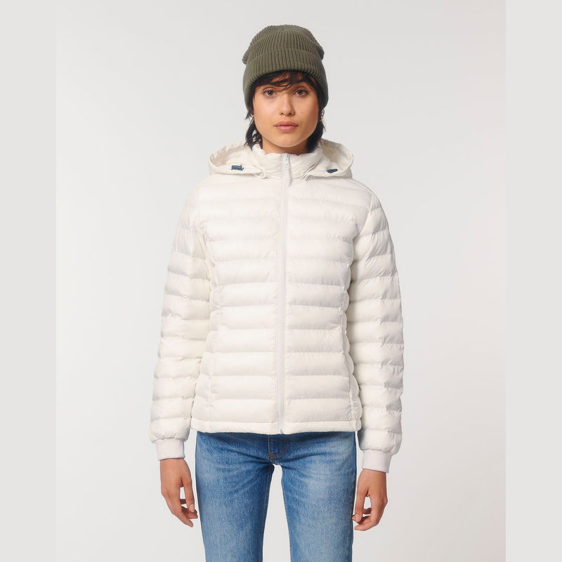Elegáns steppelt dzseki magas gallérral, levehető kapucnival, állítható szegéllyel és letisztult cipzáras zsebekkel. Karcsúsított.