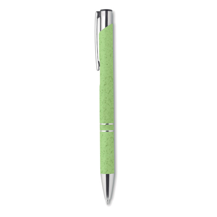 Nyomógombos golyóstoll 50% búzaszalmából és 50% ABS műanyagból, ezüst színű szerelvényekkel. Kéken író betéttel.
