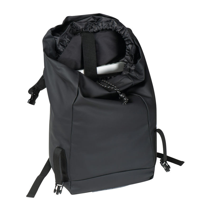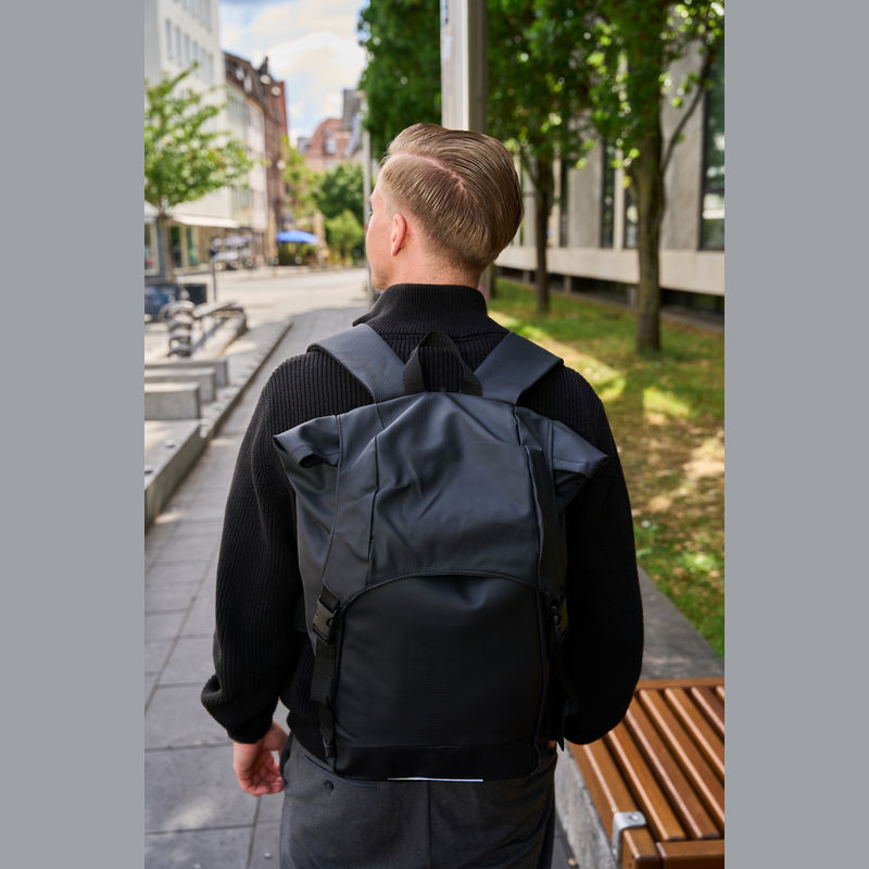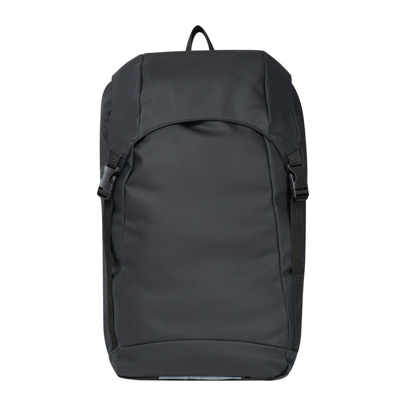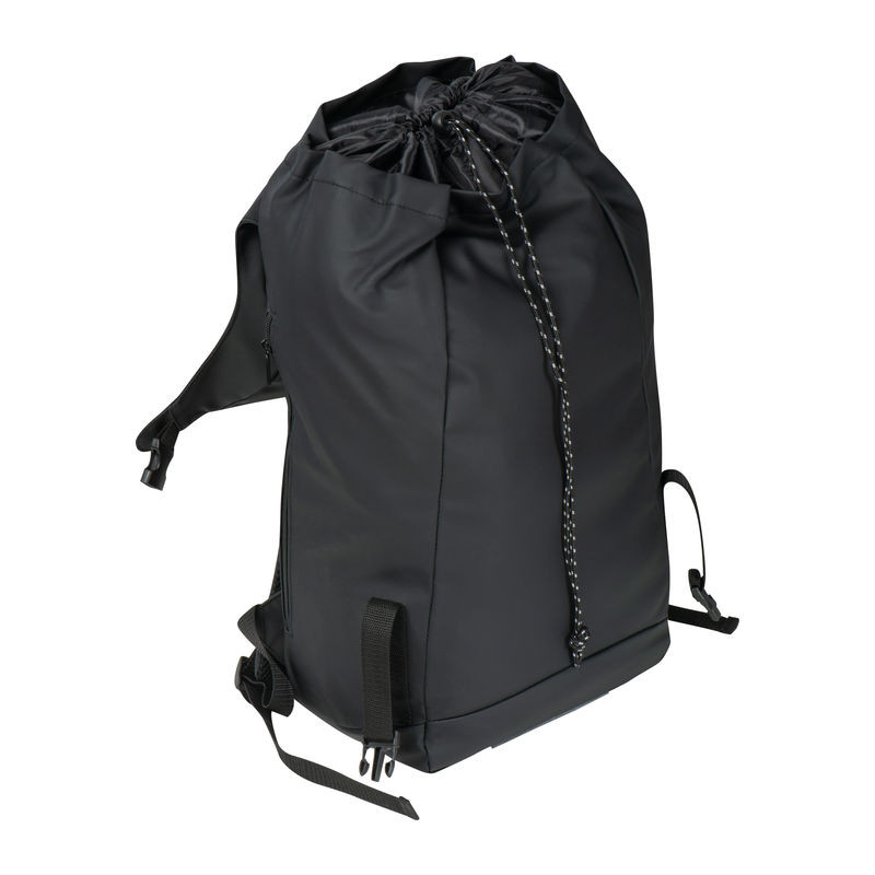 Nagyméretű poliészter túrahátizsák vízlepergető PU bevonattal. Tágas fő rekesszel rendelkezik, laptoptokkal és párnázott hátlappal, valamint két cipzáras zsebbel a jobb és a bal külső oldalon. Zsinórral zárható, amely esőben szárazon tartja a táska tartalmát.