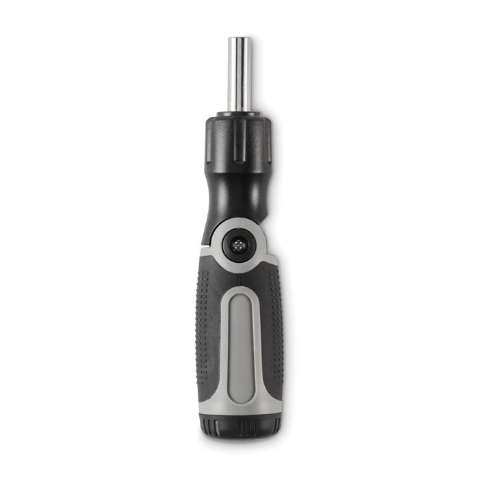 Hajlítható csavarhúzókészlet ABS nyéllel és 12 vas bitfejjel, köztük csillag, lapos, imbusz és torx típusokkal.
