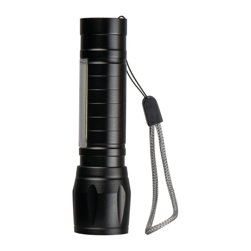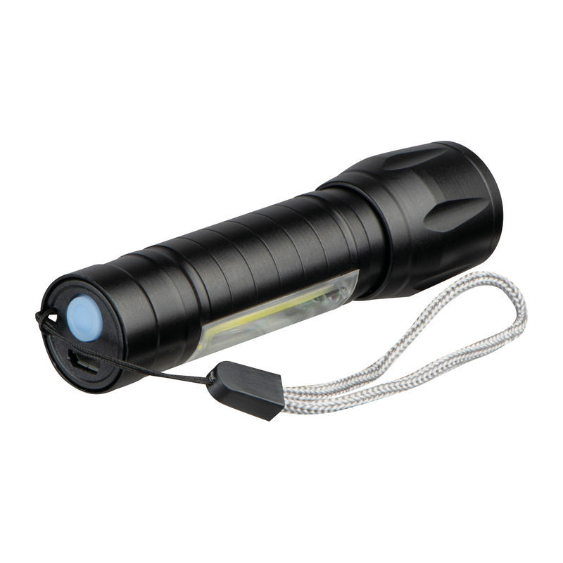Újratölthető alumínium zseblámpa 400 mAh kapacitással, USB-C töltőkábellel. A lámpa állítható fénykúpú LED-fénnyel és COB-fénnyel rendelkezik.