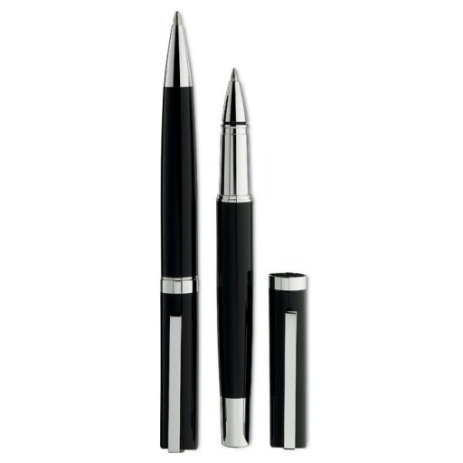 Sárgarézből és rozsdamentes acélból készült tollkészlet díszdobozban. Csavarzáras golyóstoll kéken író, illetve roller toll feketén író betéttel.