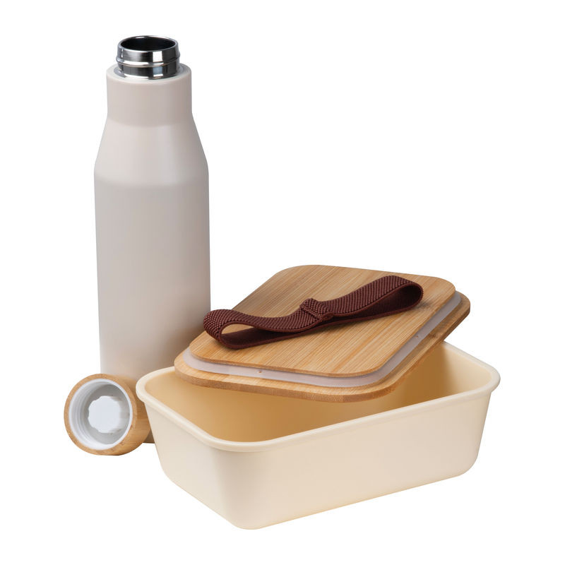 Praktikus készlet, amely egy 1000 ml-es polipropilén uzsonnás- vagy ételhordó dobozból áll bambusz tetővel és rögzítő gumiszalaggal, valamint egy hozzá illő 500 ml-es rozsdamentes acél palackkal. Ideális útközbeni használatra, ez a szett a stílust és a funkcionalitást ötvözi, tökéletes választás egy kiadós étkezéshez. Modern kialakítása lehetővé teszi a sokoldalú kombinációkat.