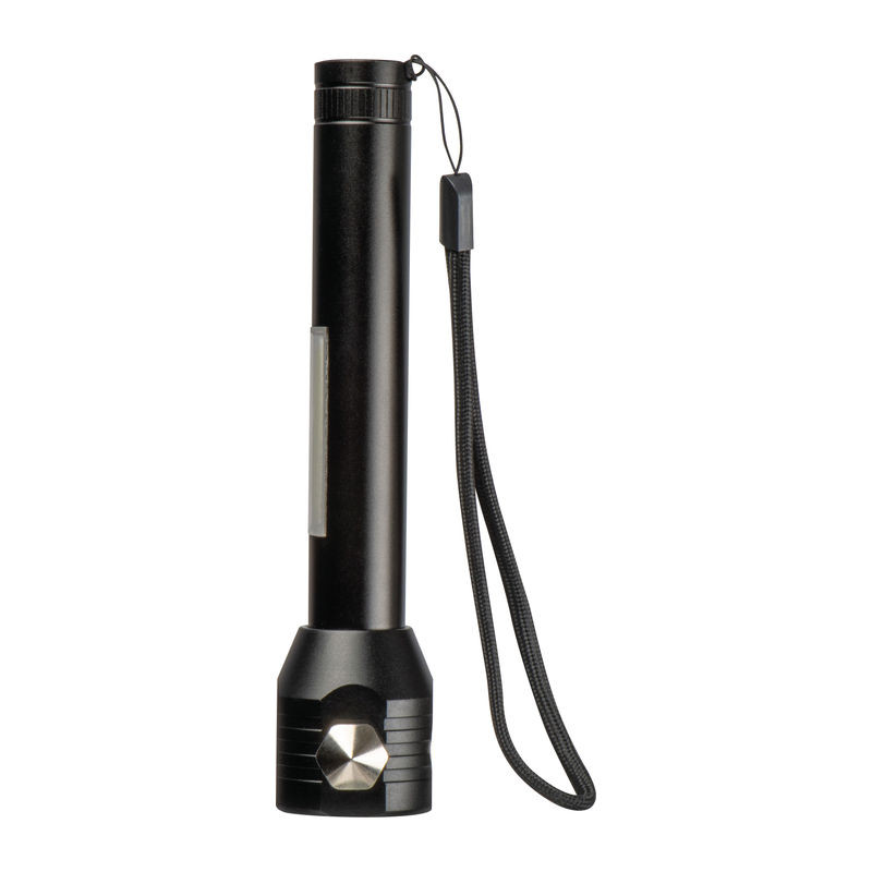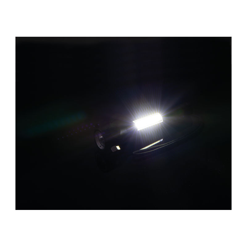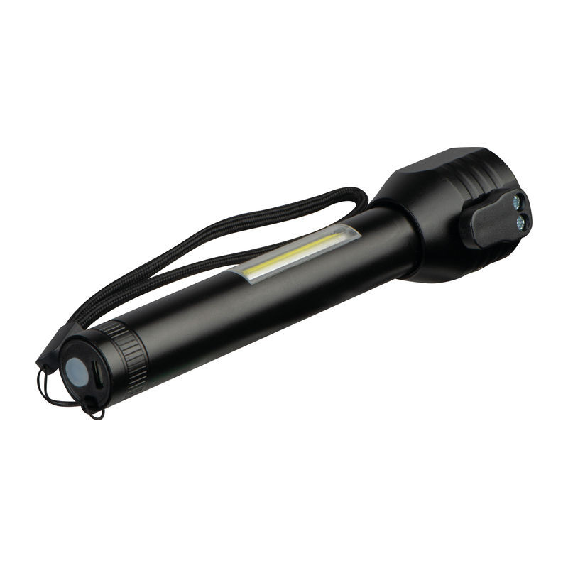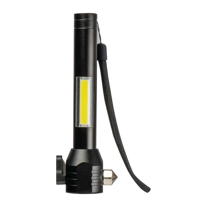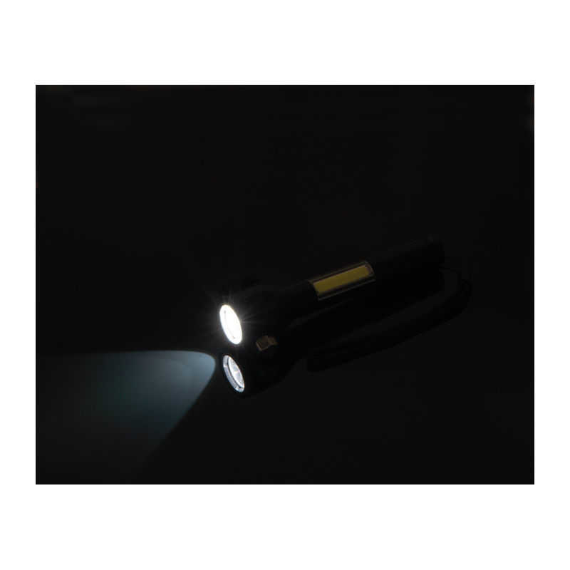 Multifunkciós, újratölthető alumínium zseblámpa 3W/120 lumen (felül) és 3W/250 lumen (oldalt) fényerővel. 500 mAh kapacitással, Type-C töltési funkcióval, mágnessel, biztonsági kalapáccsal és biztonságiöv vágóval felszerelve vészhelyzetekre.