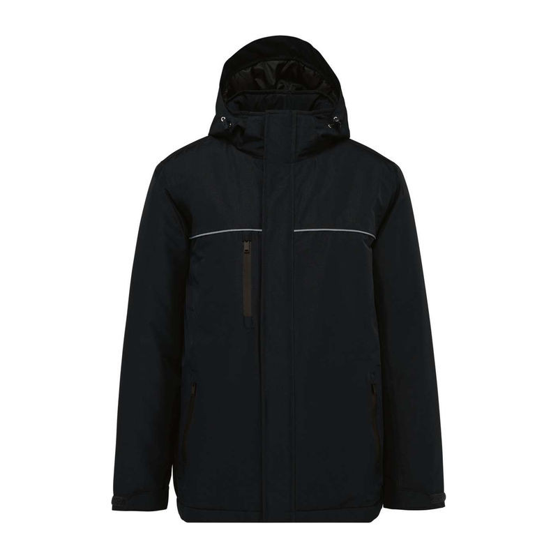 100% polyester;Outer: 100% polyester ripstop;2-layer bonded breathable 3000g/m2/24h and waterproof 10000 mm fabric;Complies with standard EN343:2019. Class 3 (garment protects against rain);Lining: 100% polyester;100% polyester inner padding;Front: 2 side pockets and 1 chest pocket with waterproof nylon zip fastenings;1 inner pocket with tear release fastening;Zip fastening with storm flap and tear release fastening;Contrasting piping at the chest;Lined and padded 3-panel hood detachable using an adjustable zip with stoppers and tear release fastening;Adjustable cuff with tear release fastening;2-part lining: upper part fleece. lower part padded;Hem adjustable with stoppers;Invisible inner zip for decoration: 1 left. 1 hem;Hanging loop inside neck;Tear-away brand label;