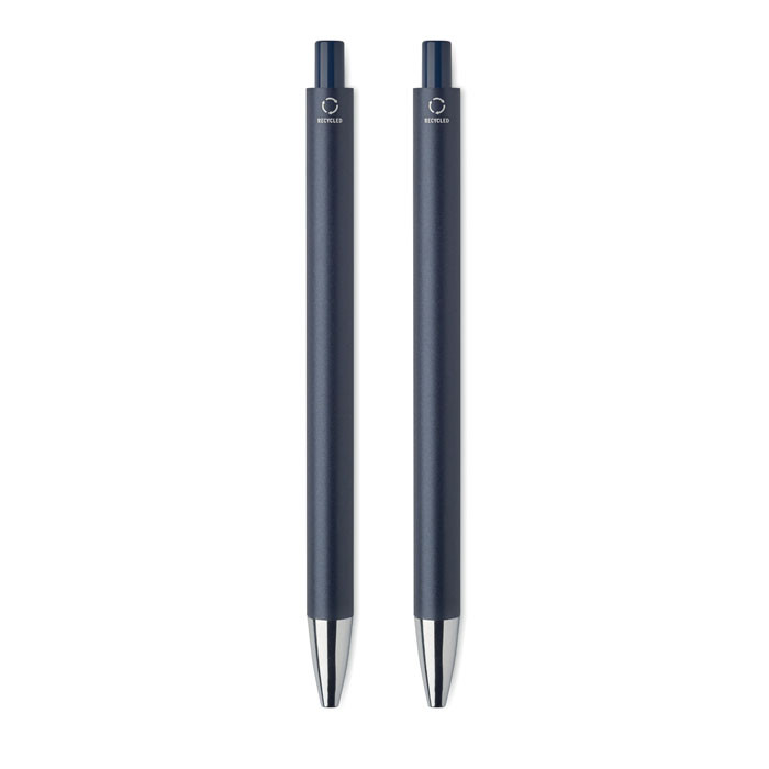 Újrahasznosított alumínium tollkészlet, golyóstollal és grafit, tintamentes tollal. Kéken író betéttel. Újrahasznosított papírdobozban.