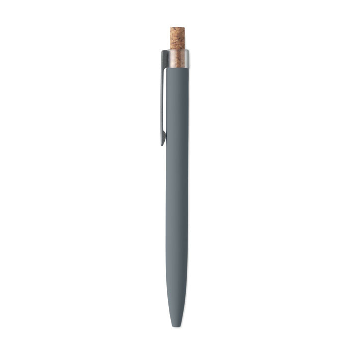 Újrahasznosított alumínium golyóstoll, színazonos tetejű, parafa nyomógombbal, színazonos fém csíptetővel. Kéken író betéttel.
