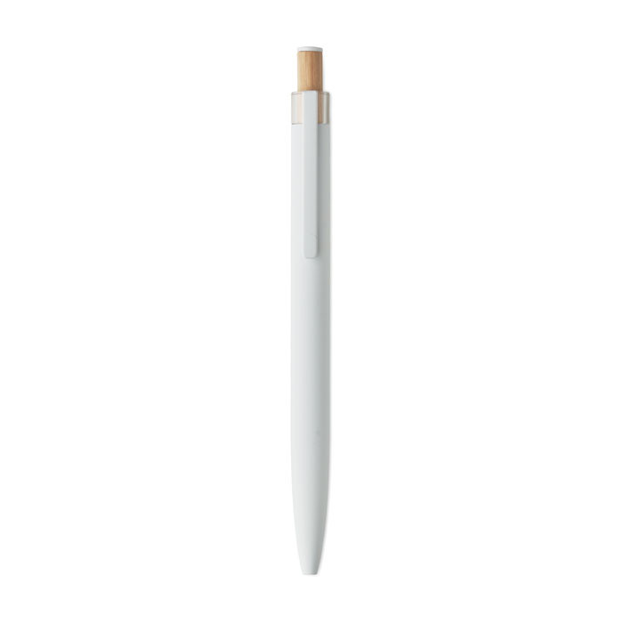 Újrahasznosított alumínium golyóstoll, színazonos tetejű, bambusz nyomógombbal, színazonos fém csíptetővel. Kéken író betéttel.