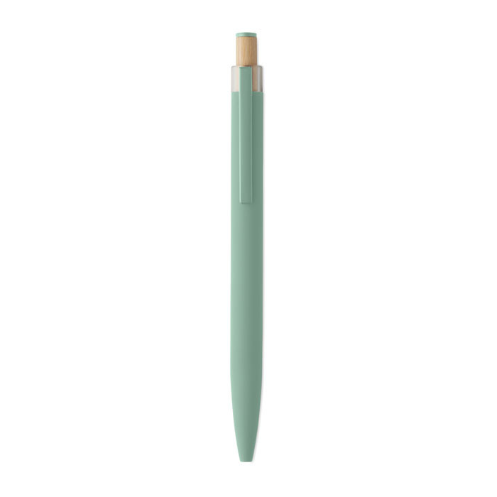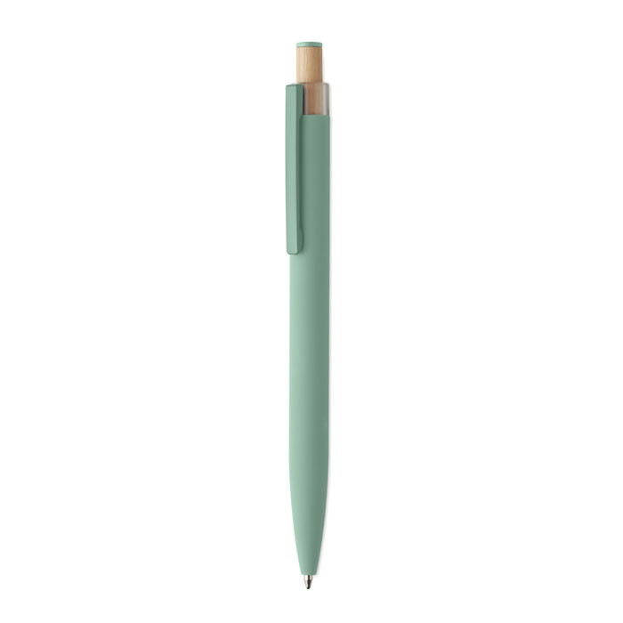 Újrahasznosított alumínium golyóstoll, színazonos tetejű, bambusz nyomógombbal, színazonos fém csíptetővel. Kéken író betéttel.