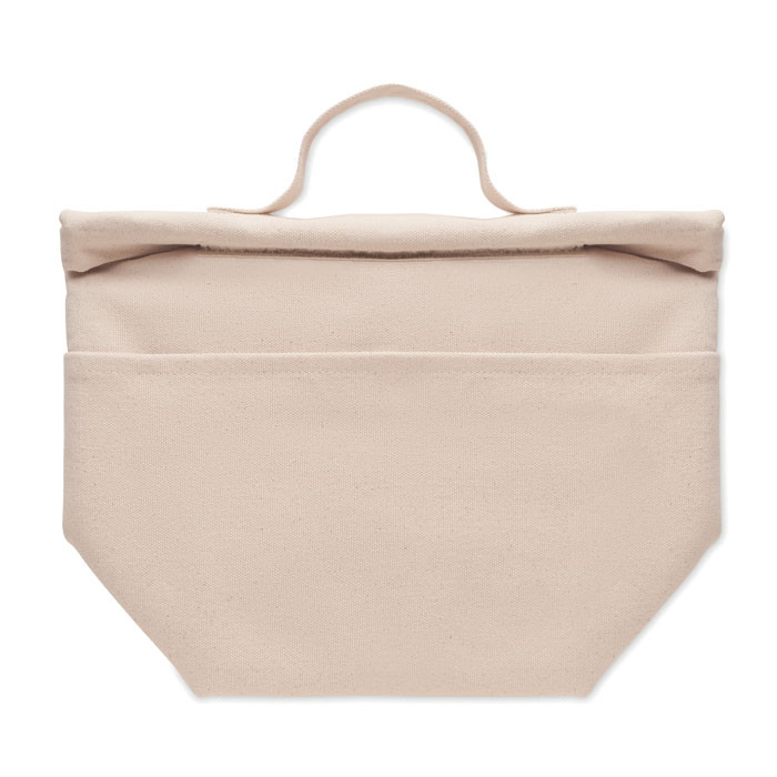 Újrahasznosított kevertszálas (70% újrahasznosított pamut, 30% újrahasznosított poliészter) hőszigetelt uzsonnás táska, roll top csavart, tépőzáras záródással. Szigetelés: 3 mm-es PE hab 12C PEVA-val.