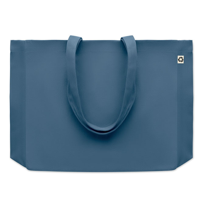 Újrahasznosított vászon bevásárlótáska vagy strandtáska hosszú füllel, oldalsó toldással. 50% pamut és 50% újrahasznosított pamut, 280 g vastag anyag.