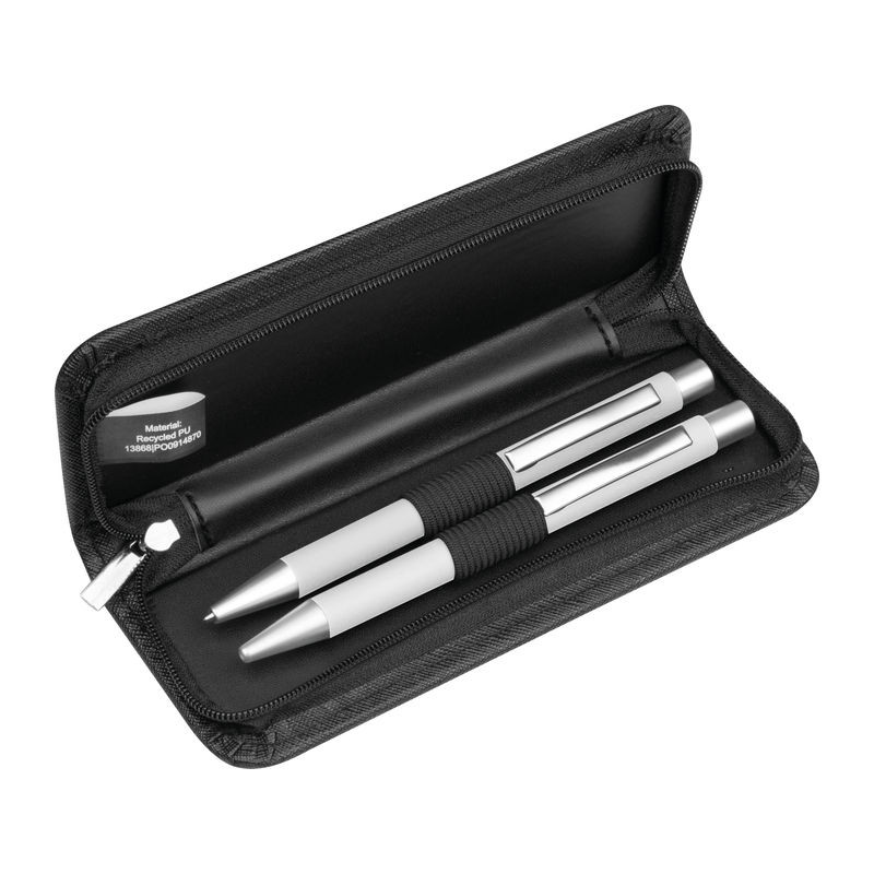 Kék tintával író tollkészlet golyóstollal, ezüst díszítésekkel és hozzá illő mechanikus ceruzával elegáns PU tokban. Tökéletes a stílusos íráshoz!